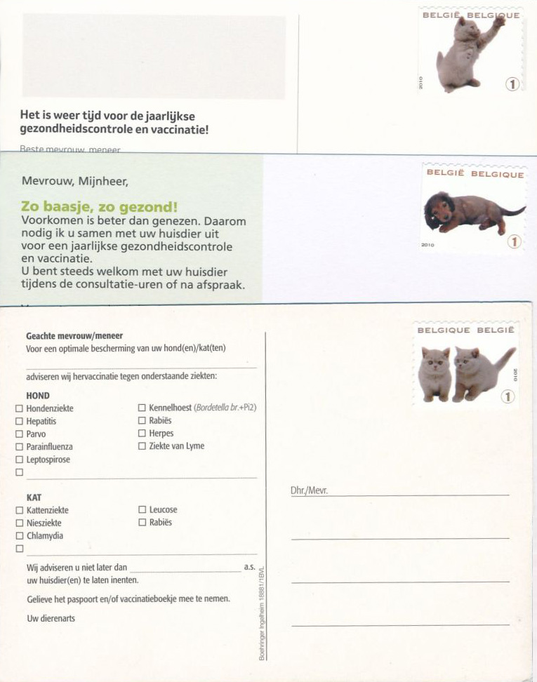Chaque année, les propriétaires doivent être rappelés des vaccinations de leurs animaux. Il existe de belles cartes à cet effet et, grâce à des timbres adaptés, nous nous assurons que les propriétaires ne les manquent pas.