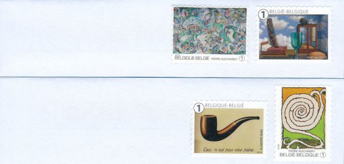 Une exposition sur l'art moderne belge méritait un effort supplémentaire pour les invitations. Nous recherchions des timbres à affranchir représentant des œuvres de la même époque, voire des mêmes artistes. Un travail qui prend du temps, mais l'invitation n'est pas passée inaperçue.